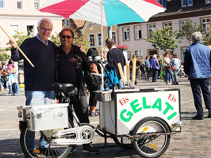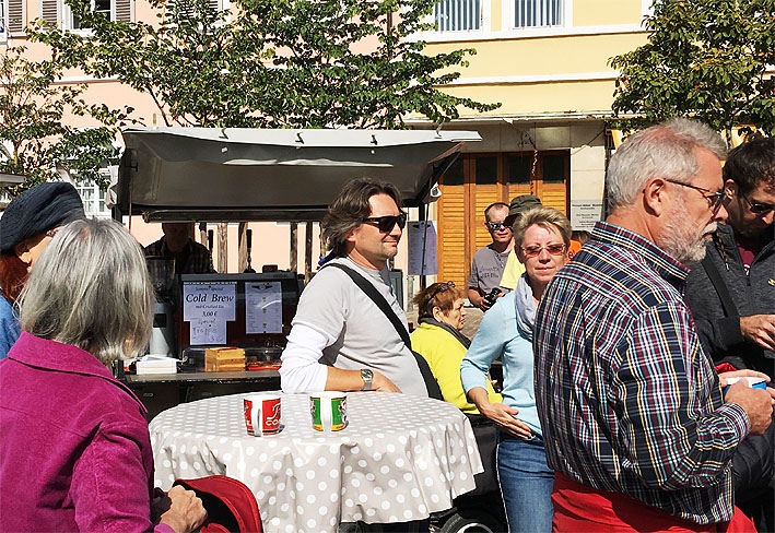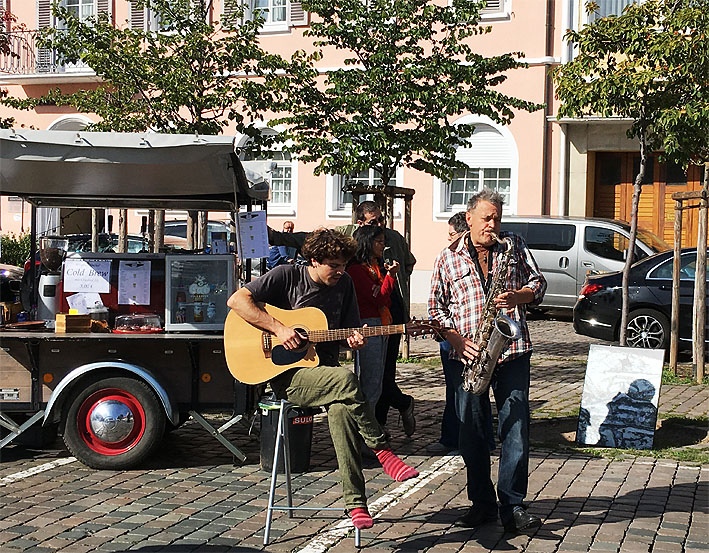 Am mobilen Kaffeestand standen die Kaffeedurstigen teilweise Schlange, daneben konnte man sich gegen eine Spende mit Kuchen bedienen. Bei strahlendem Sonnenschein schmeckte auch der Wein und Schorle vom Weinkontor Pfalz und bei Alberto, dem Wirt des Sole D’Oro, der auf dem Platz auftischte, mundeten Pizza und Nudelgerichte.